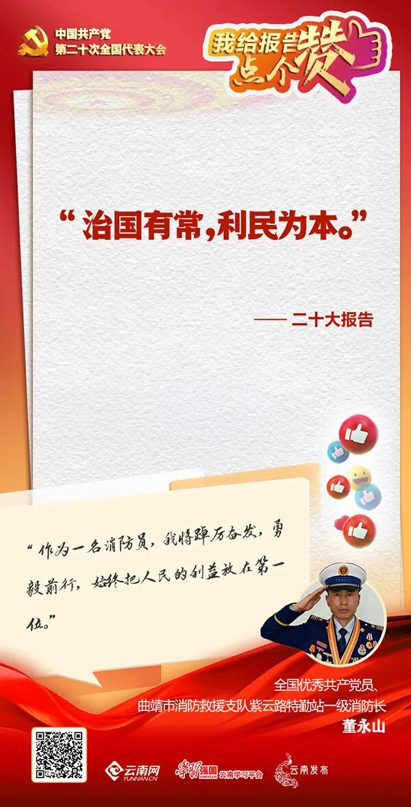“党的二十大报告指出,要‘坚持人民至上’‘治国有常,利民为本’。”全国优秀共产党员、曲靖市消防救援支队紫云路特勤站一级消防长董永山表示,这体现了党的理想信念、性质宗旨、初心使命,实践说明我们党是给人民办实事,为人民谋幸福的,就是要让人民的生活一天天好起来,一年比一年过得的好。