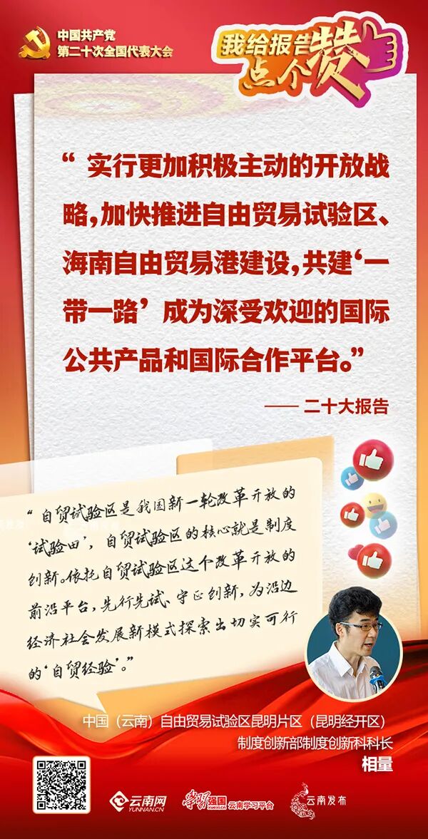 “我要给报告中出现的高频词‘创新’‘开放’点个赞。”中国(云南)自由贸易试验区昆明片区(昆明经开区)制度创新部制度创新科科长相量说,作为一名自贸试验区的建设者和制度创新工作的谋划者,内心油然升起一股参与到区域经济发展历史进程中的自豪感和使命感,同时也感受到肩负职责使命的重要性。