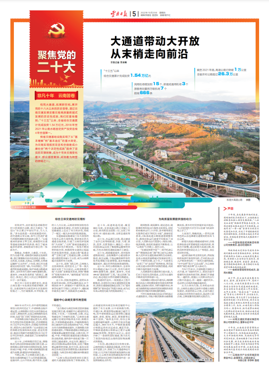 构筑大通道,拓展新空间。展开党的十八大以来的历史答卷,透过云南交通发展史看云南高质量跨越式发展的历史性成就,我们欣喜地看到:“十三五”以来,全省综合交通累计完成投资1.54万亿元,2018年至2021年公路水路固定资产投资连续4年全国第一。