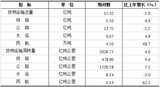 全年货物运输总量15.32亿吨,比上年下降1.0%。货物运输周转量2026.75亿吨公里,增长4.0%。