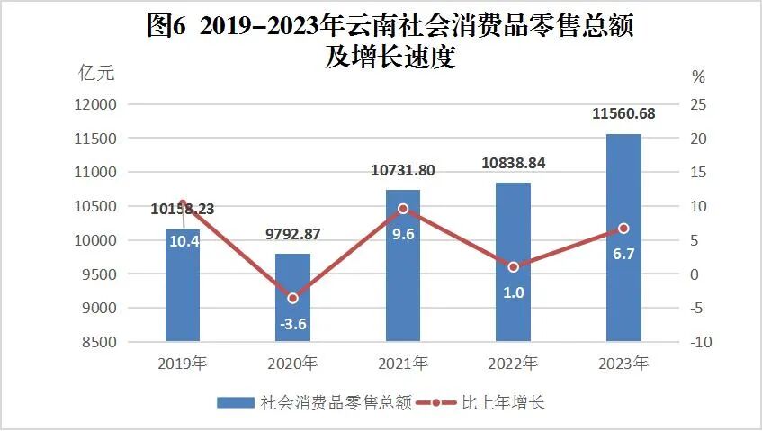 全年社会消费品零售总额11560.68亿元,比上年增长6.7%。分经营地看,城镇消费品零售额10053.19亿元,增长6.6%;乡村消费品零售额1507.49亿元,增长7.4%。分消费形态看,商品零售9752.96亿元,增长4.6%;餐饮收入1807.72亿元,增长19.2%。