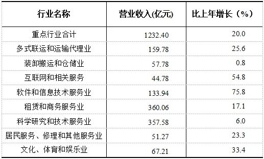 全年规模以上服务业[11] 实现营业收入3187.60亿元,比上年增长18.9%。重点行业营业收入增长20.0%。其中,多式联运和运输代理业增长25.6%,装卸搬运和仓储业增长0.8%,互联网和相关服务增长54.8%,软件和信息技术服务业增长75.8%,租赁和商务服务业增长17.1%,科学研究和技术服务业增长6.0%,居民服务、修理和其他服务业增长23.3%,文化体育和娱乐业增长33.4%。