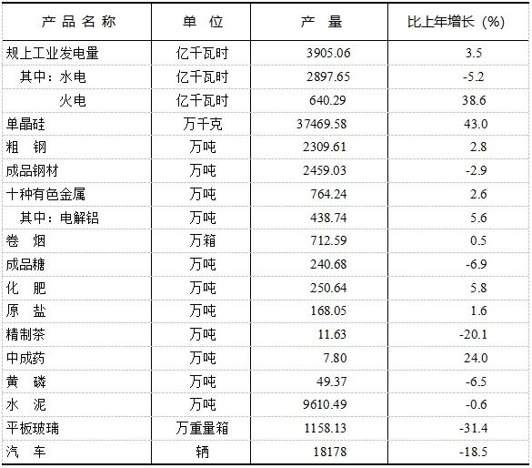 全年规模以上工业十种有色金属产量764.24万吨,比上年增长2.6%。其中电解铝产量438.74万吨,增长5.6%。单晶硅产量37469.58万千克,增长43.0%。化肥产量250.64万吨,增长5.8%。原盐产量168.05万吨,增长1.6%。卷烟产量712.59万箱,增长0.5%。