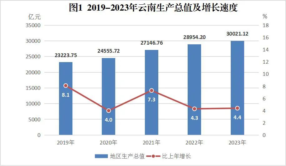 根据地区生产总值统一核算初步结果,2023年云南实现地区生产总值(GDP)[2] 30021.12亿元,比上年增长4.4%。其中,第一产业增加值4206.63亿元,增长4.2%;第二产业增加值10256.34亿元,增长2.4%;第三产业增加值15558.15亿元,增长5.7%。三次产业对经济增长的贡献率分别为13.6%、18.2%、68.2%。三次产业结构为14.0∶34.2∶51.8。全省人均地区生产总值64107元,增长4.6%。全年全员劳动生产率[3] 10.52万元/人,比上年提高5.4%。