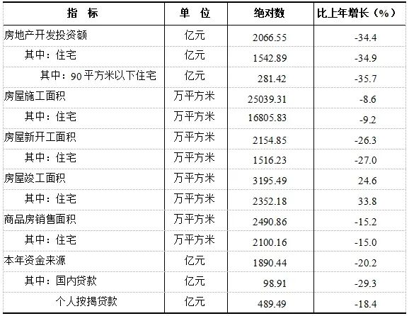 全年房地产开发投资2066.55亿元,比上年下降34.4%,其中,商品住宅投资1542.89亿元,下降34.9%;办公楼投资68.65亿元,下降37.5%;商业营业用房投资207.80亿元,下降29.4%。