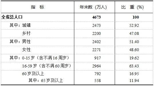 年末全省常住人口4673万人。全年出生人口38.5万人,出生率为8.22‰;死亡人口40.3万人,死亡率为8.61‰;自然增长率为-0.39‰。年末全省城镇人口2473万人,乡村人口2200万人,城镇化率52.92%,比上年末提高1.2个百分点。